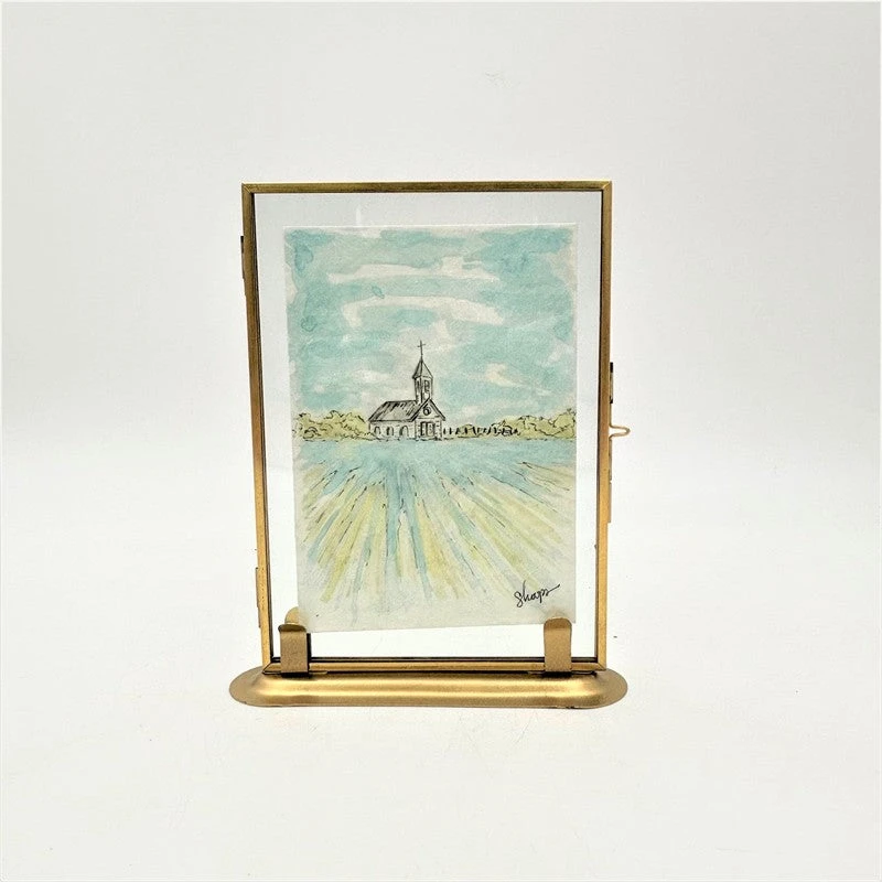 Add a touch of vintage charm to your home with our Brass Framed Table Art featuring an idyllic Church in a Field. The brass frame adds a touch of elegance, making it a perfect addition to any room. Let this art piece transport you to a peaceful countryside setting.