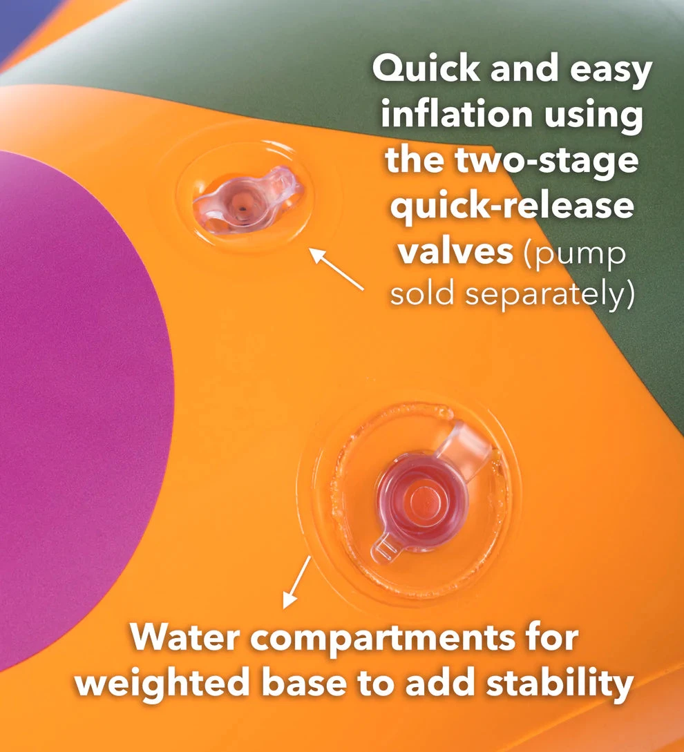 - Quick and easy inflation using the two-stage quick-release valves (pump sold separately, 733454); connects to a standard garden hose