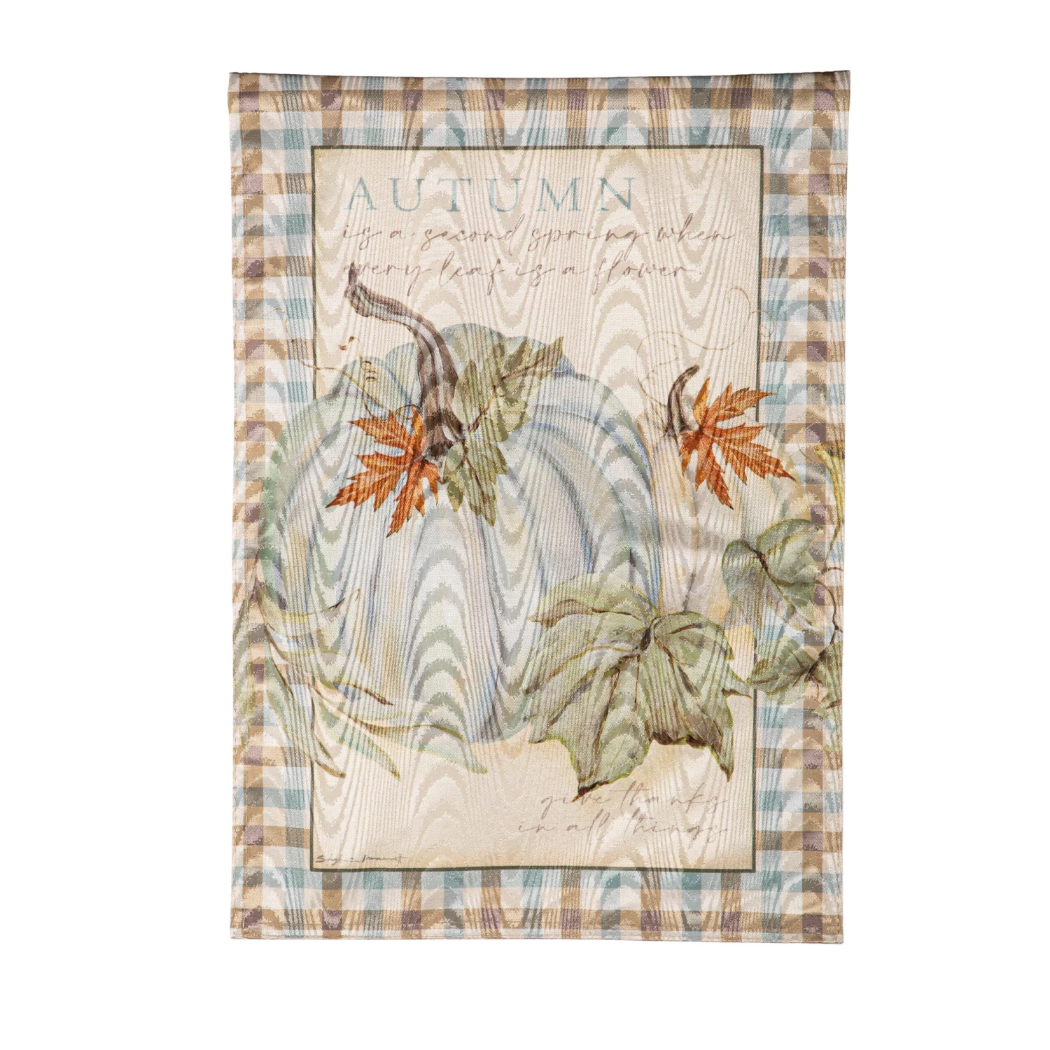 Welcome friends and family to the home with this moire garden flag. It features two lightly colored pumpkins sounded by fall foliage with a checkered border around the edges. Evergreen’s Moire flags deliver unmatched shimmer with a beautiful woodgrain effect that enhances each seasonal design. Artwork is heat-transferred onto both sides of the taffeta like fabric with UV-protected dyes to guarantee vibrancy and durability through all seasons.