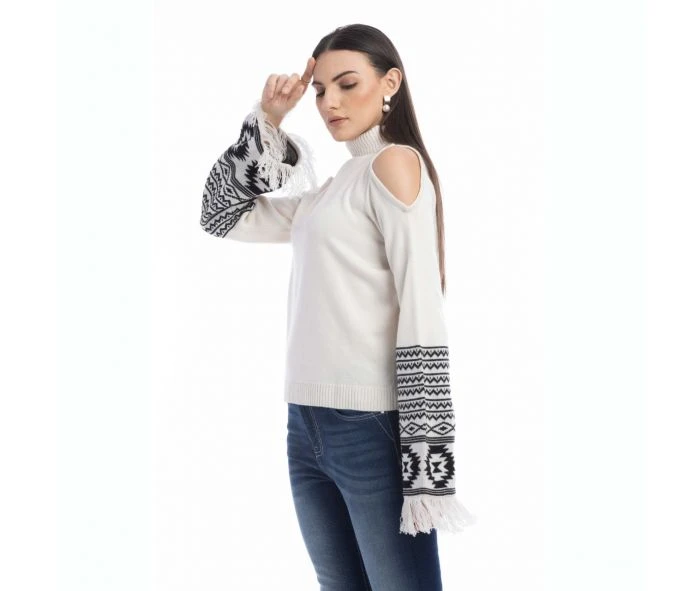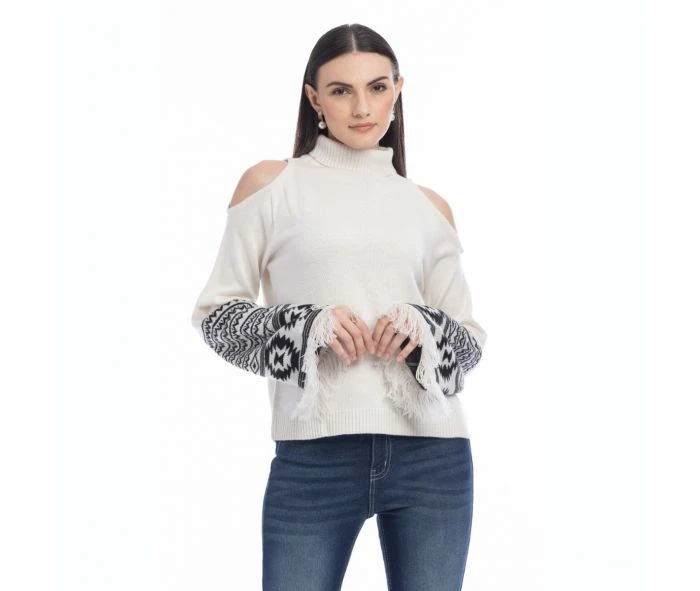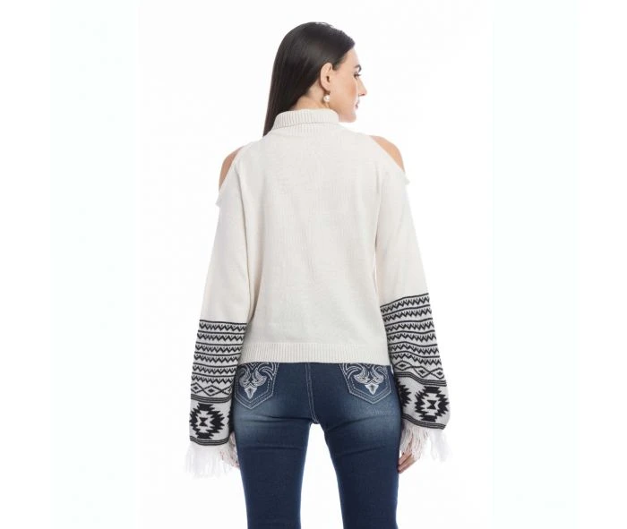 This gorgeous turtle neck sweater features a beautiful tribal-inspired design on the sleeves, which are also trimmed in string fringe. A truly striking top, it will also keep you snug and warm.Â