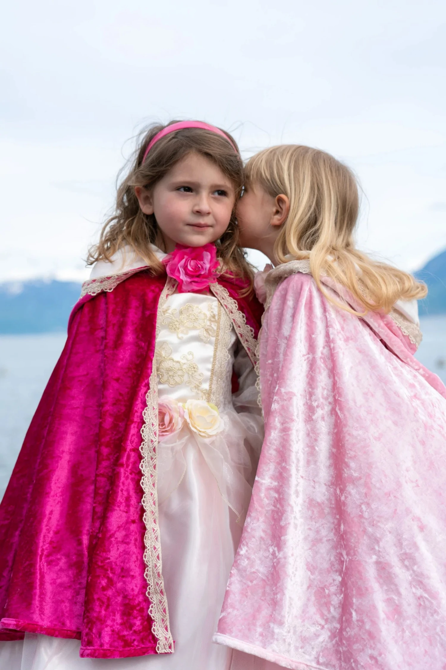 This crushed dusty rose / antique pink velour cape with embroidered gold trim made with love and magic is truly fit for a princess. The hood is lined with high-quality 96gsm cream satin, which is soft against your child’s skin. Pair this cape with one of our beautiful gowns. Proudly made in Canada.Â