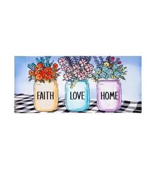 Welcome neighbors and guests in rustic style with this “Faith Love Home” Mason Jars Garden Linen Flag. Filled with blooming flowers that boast textured details, the mason jars sit under a welcoming banner for a delightful design. Made of lightweight, durable linen material, this lively flag is designed to withstand a variety of weather conditions. Our flag creation process involves combining pieces of fade-resistant fabric with tight, detailed stitching in order to create a dimensional effect. Printed ink colors are protected with a watertight seal to ensure long lasting enjoyment.