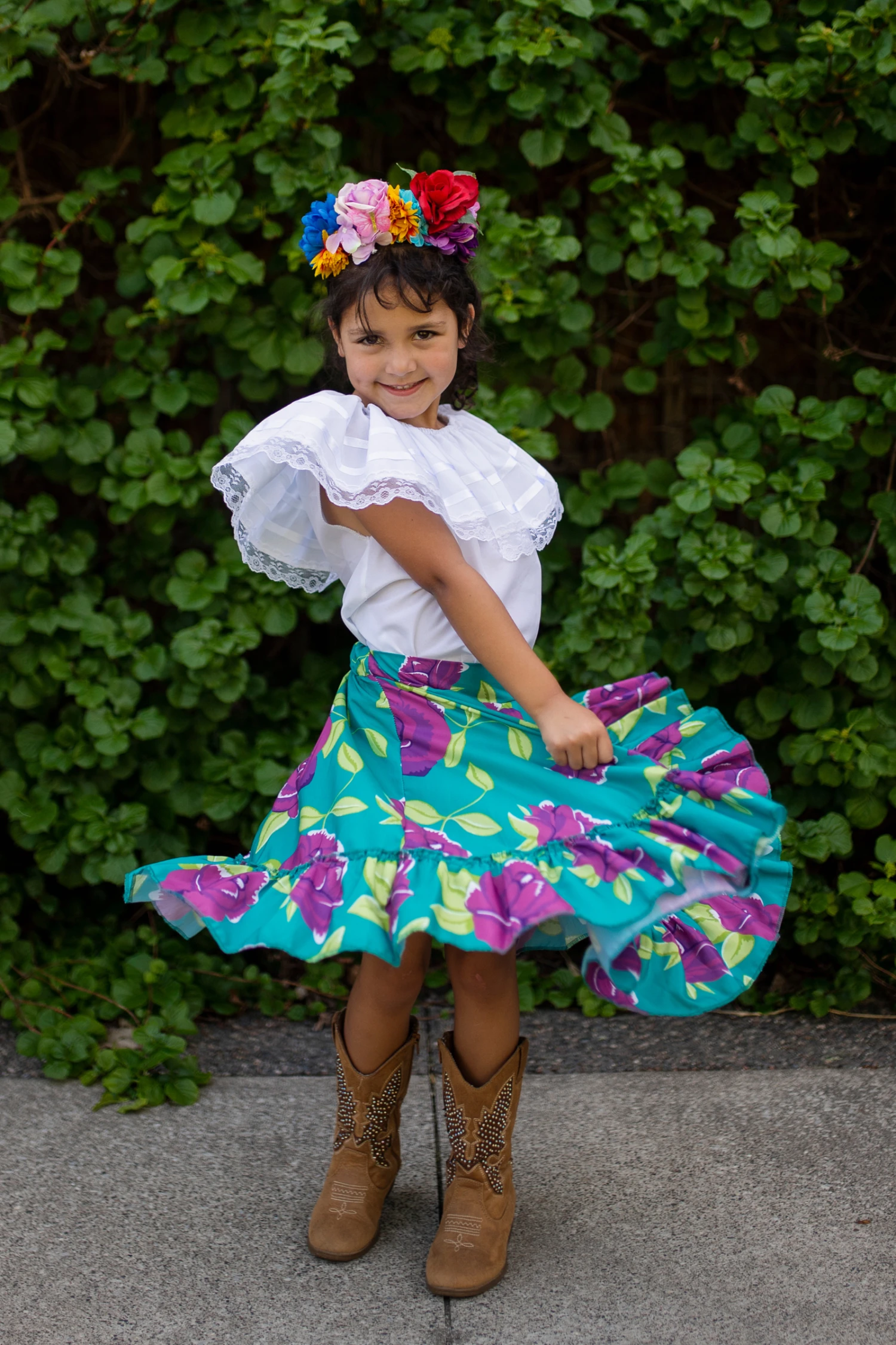 Unleash your creativity with our Frida the Artist set. With a flouncy floral skirt, crisp white ruffled off-the-shoulder blouse, and vibrant flowery headpiece, this outfit is sure to inspire a masterpiece!Â