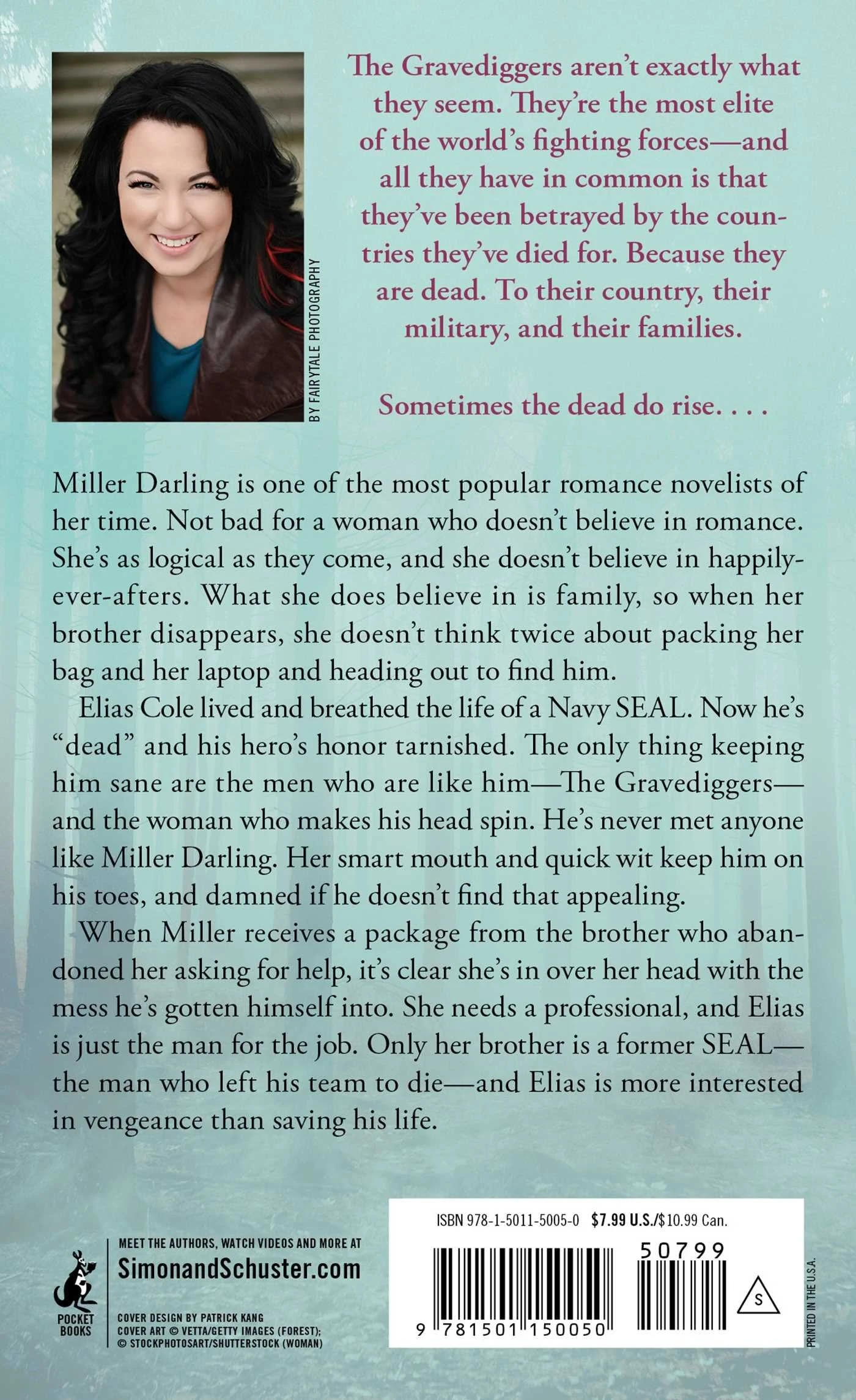 Elias Cole lived and breathed the life of a Navy SEAL. Now he’s “dead” and his hero’s honor tarnished. The only thing keeping him sane are the men who are like him—The Gravediggers—and the woman who makes his head spin. He’s never met anyone like Miller Darling. Her smart mouth and quick wit keep him on his toes, and damn if he doesn’t find that appealing.