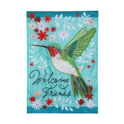 This charming flag adds an extra special touch to any home. It features darling hummingbird surrounded by flowers. Each Evergreen Flag applique flag is carefully crafted from multiple layers of 310 denier nylon made from recycled plastic that can withstand a variety of weather conditions. We combine pieces of fade-resistant, strong fabric with tight, detailed stitching to create a dimensional mosaic effect. The soft yet heavyweight material illuminates beautifully in sunlight. Each flag features a sleeve that fits standard flagpoles or stands, sold separately. Due to the nature of the packaging, wrinkling may have occurred. Once item is unfolded and mounted on hardware, the creases will naturally fall out. Spot clean only. Never put in a dryer. When not in use, flags can be hung in a closet or placed in a storage container.