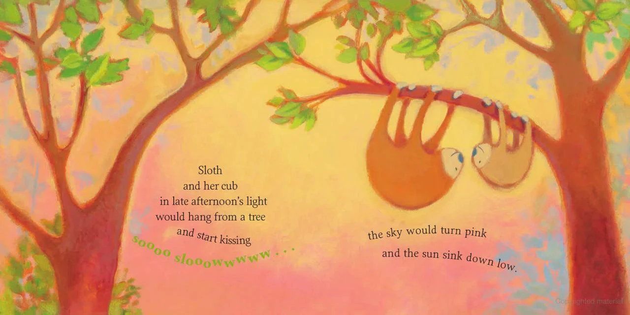 In a cozy bedtime chat with her mom, a young girl wonders how animal families might say good night. Would Wolf and his pup “kiss and then HOWL”? Would Bear and her cub “kiss and then GROWL”? But what about Sloth and her baby? They move soooo slooowwwww . . . they’re sure to be kissing from early evening until long after everyone else is fast asleep!