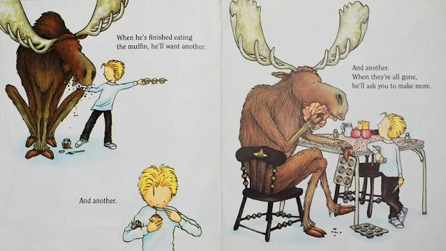 If a big hungry moose comes to visit, you might give him a muffin to make him feel at home. If you give him a muffin, he’ll want some jam to go with it. When he’s eaten all your muffins, he’ll want to go to the store to get some more muffin mix…