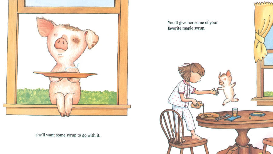 If you give a pig a pancake, she’ll want some syrup to go with it. You’ll give her some of your favorite maple syrup, and she’ll probably get all sticky, so she’ll want to take a bath. She’ll ask you for some bubbles. When you give her the bubbles…