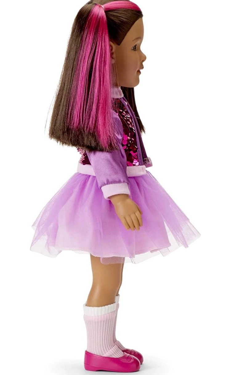 - Dressed in a lilac tutu skirt, striped tee, satin/sequin jacket, and knee socks with bright pink flats. Hair is long, in pigtails, and is brunette with a fun pink highlight; engage your child in imaginative play with this doll, teaching kindness and empathy