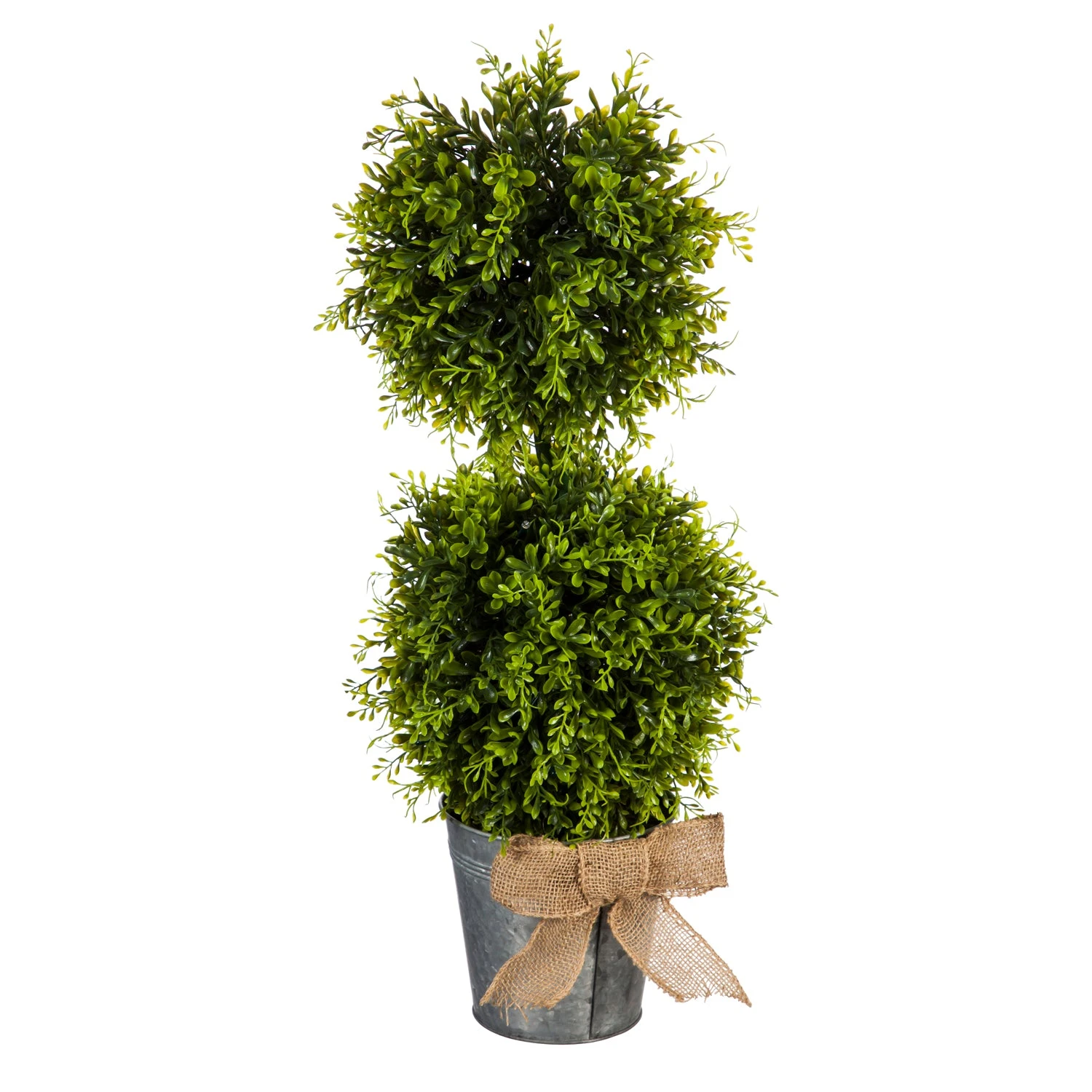 LED Boxwood Topiary With Burlap Bow In Galvanize Pot