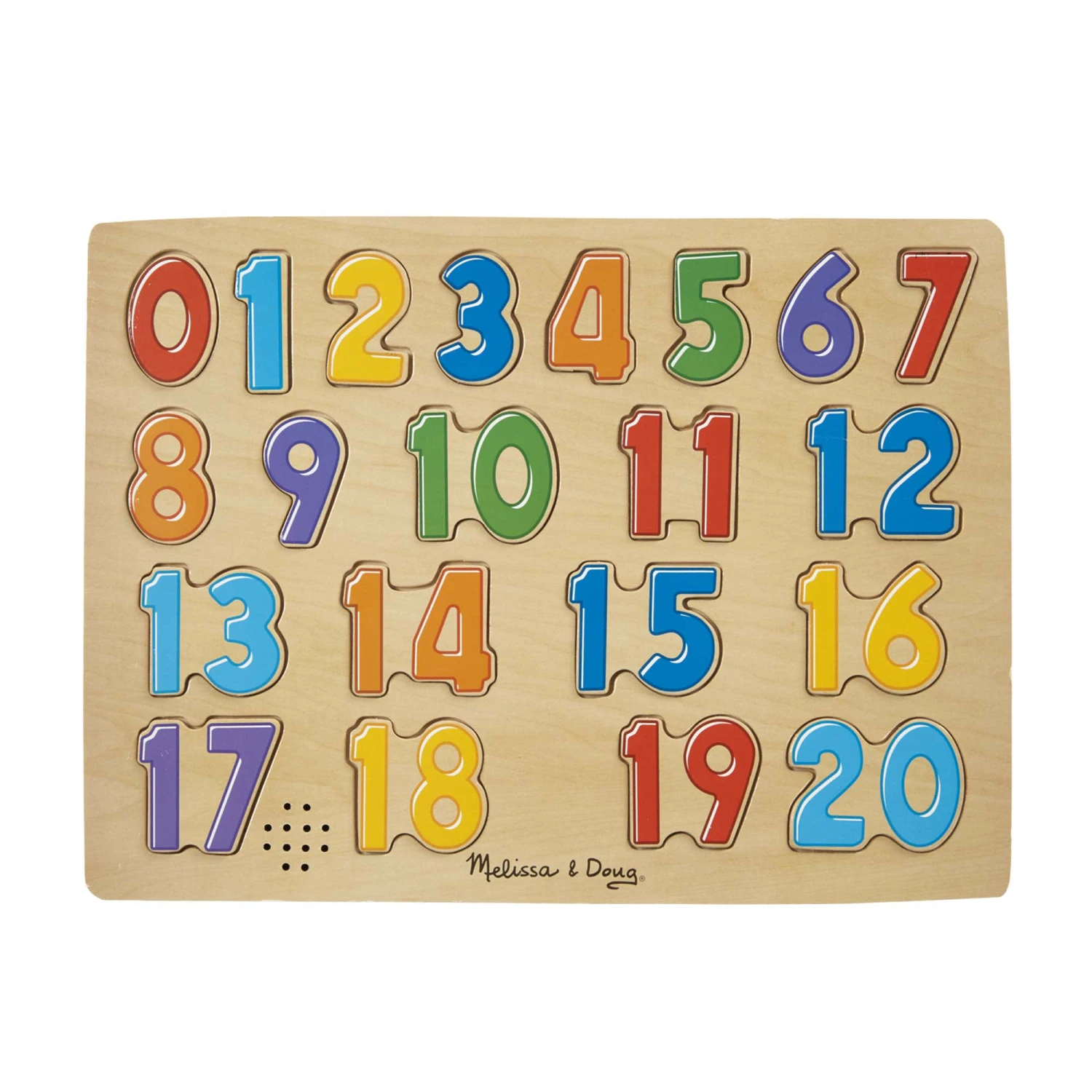 This 21-piece wooden sound puzzle pronounces the name of each number when its piece is placed correctly! Pieces are slightly raised above the puzzle board for easy grasping. Colorful pictures underneath each piece help teach counting and reinforce the relationship between quantities and numerals. This educational puzzle has lots of ways to learn and play! (TIP: Puzzle has light-activated sensors; for best results, expose the sensor by removing a piece in a brightly lit room, then make the sound play by replacing the piece in the board.)