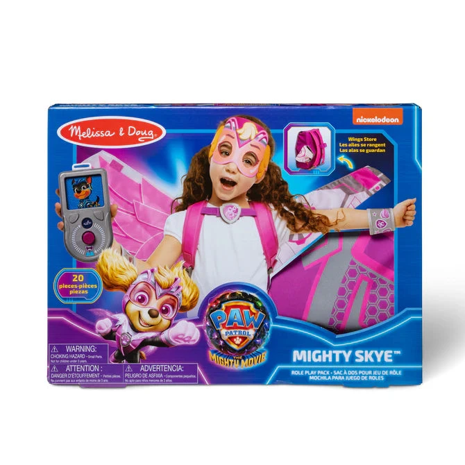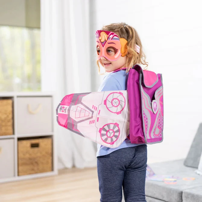 - Become Mighty Skye from PAW Patrol: The Mighty Movie with a pink and silver role play backpack with wings that fold out from built-in pockets then flip down to transform, and other pieces for pretend play