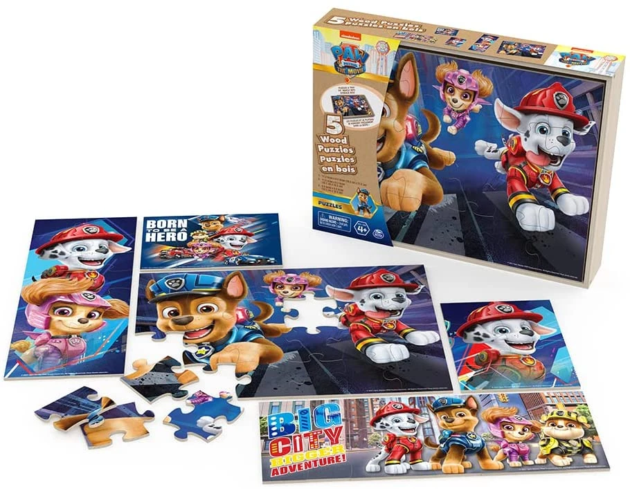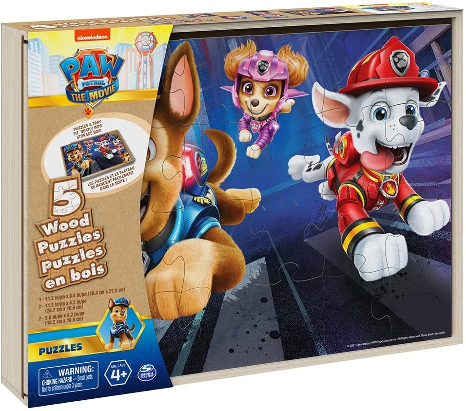 PAW PATROL MOVIE 5PK WOOD PUZZLE IN SHRINK WRAPPED WOOD TRAY