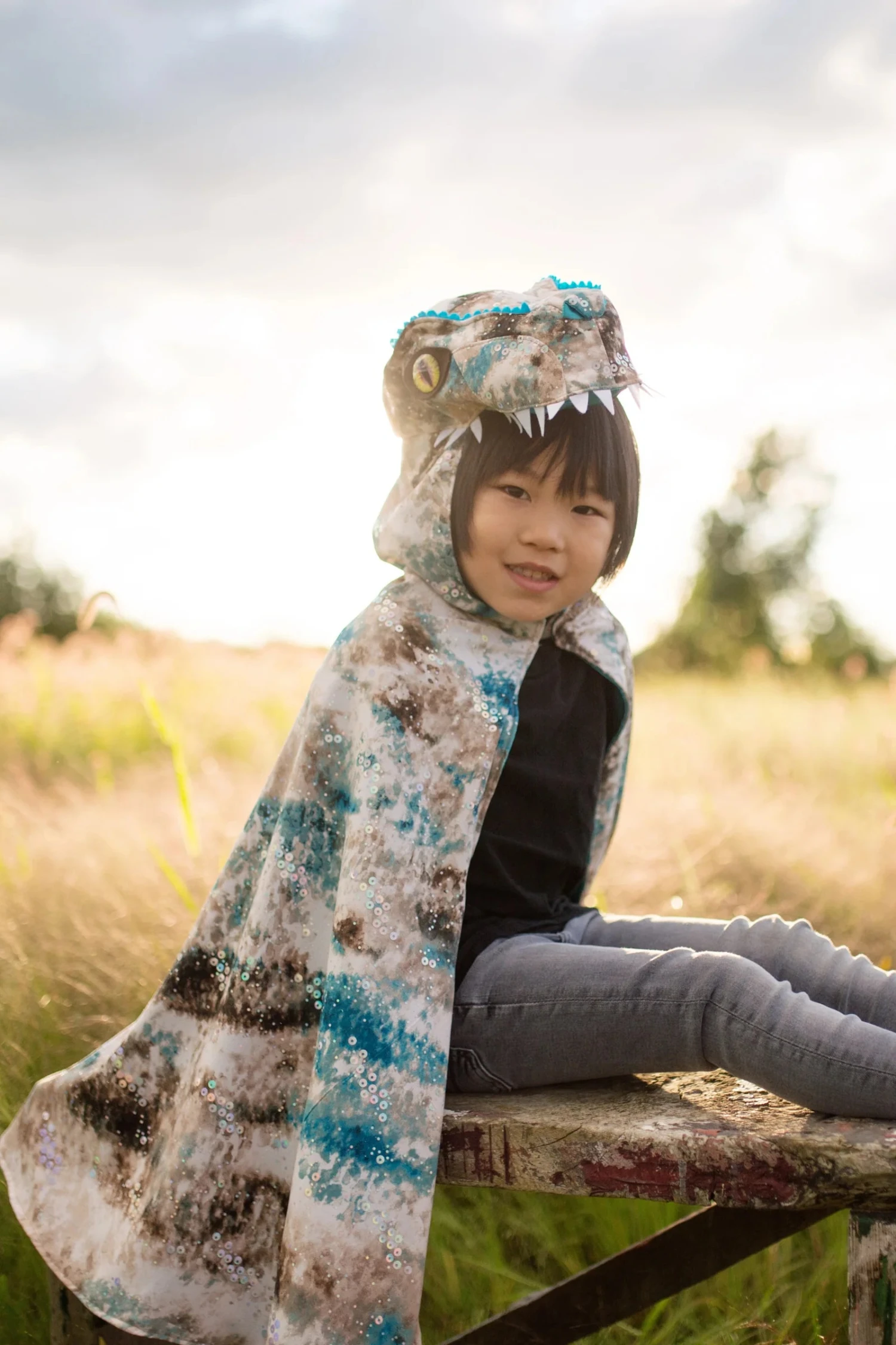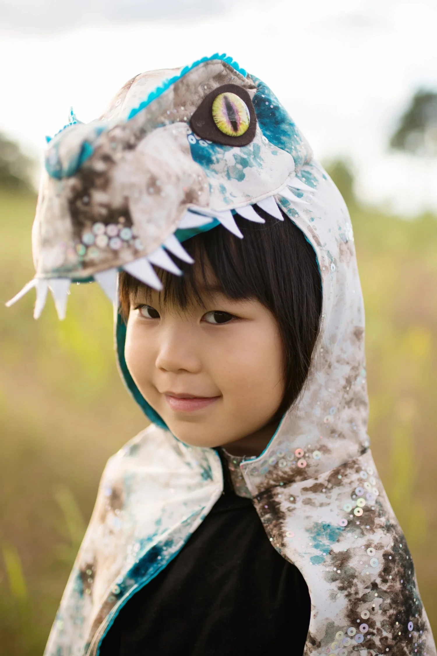 Featuring a hand-dyed teal & brown fabric, and heat-sealed sequins, our new Raptor Cape is a great addition to any dinosaur lover’s collection! The cape is lightweight and soft to the touch, making it easy to wear for a long time. The hood is made of a stiffer material to hold its shape, and the cape attaches to the back with a Velcro closure. The cape is lined with a beautiful rich teal satin & finished with realistic, vibrant green eyes!Â