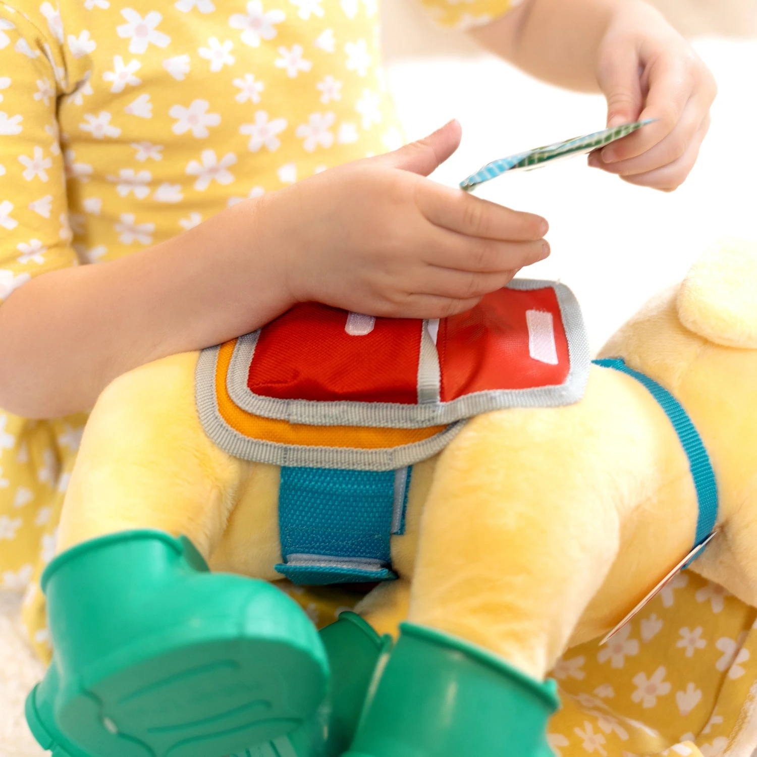 Go on pretend search and rescue adventures with an adorable canine companion! The Let’s Explore™ Ranger Dog plush pup comes ready to explore the great outdoors, thanks to the included protective shoes and safety vest (also fits most kids as a belt!) filled with rescue gear like a first-aid kit, bandages, wipes, play treat, and a play walkie-talkie with real sound effects! There’s also a certification card and activity booklet to help spark adventure ideas. Little adventurers ages 3 and older can pretend play the day away when the Let’s Explore Ranger Dog comes home to stay!
