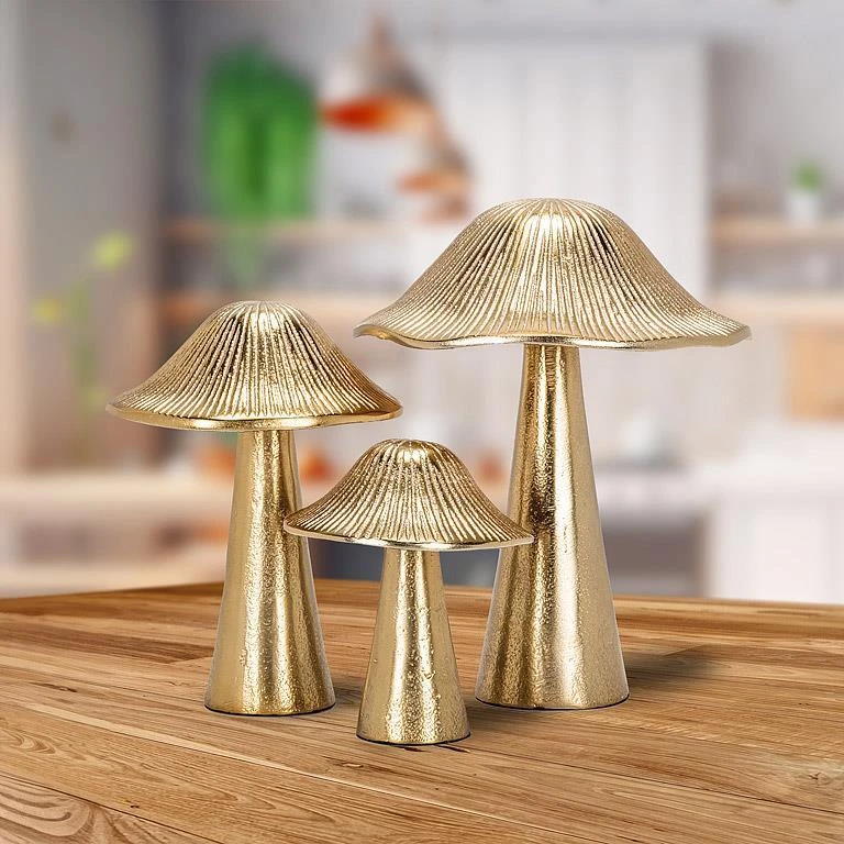 Make any space more charming and inviting with this Small Ribbed Mushroom sculpture. Crafted out of aluminum with a burnished gold finish, it makes for an stylish conversation piece that complements any type of decor. Also available in other sizes.