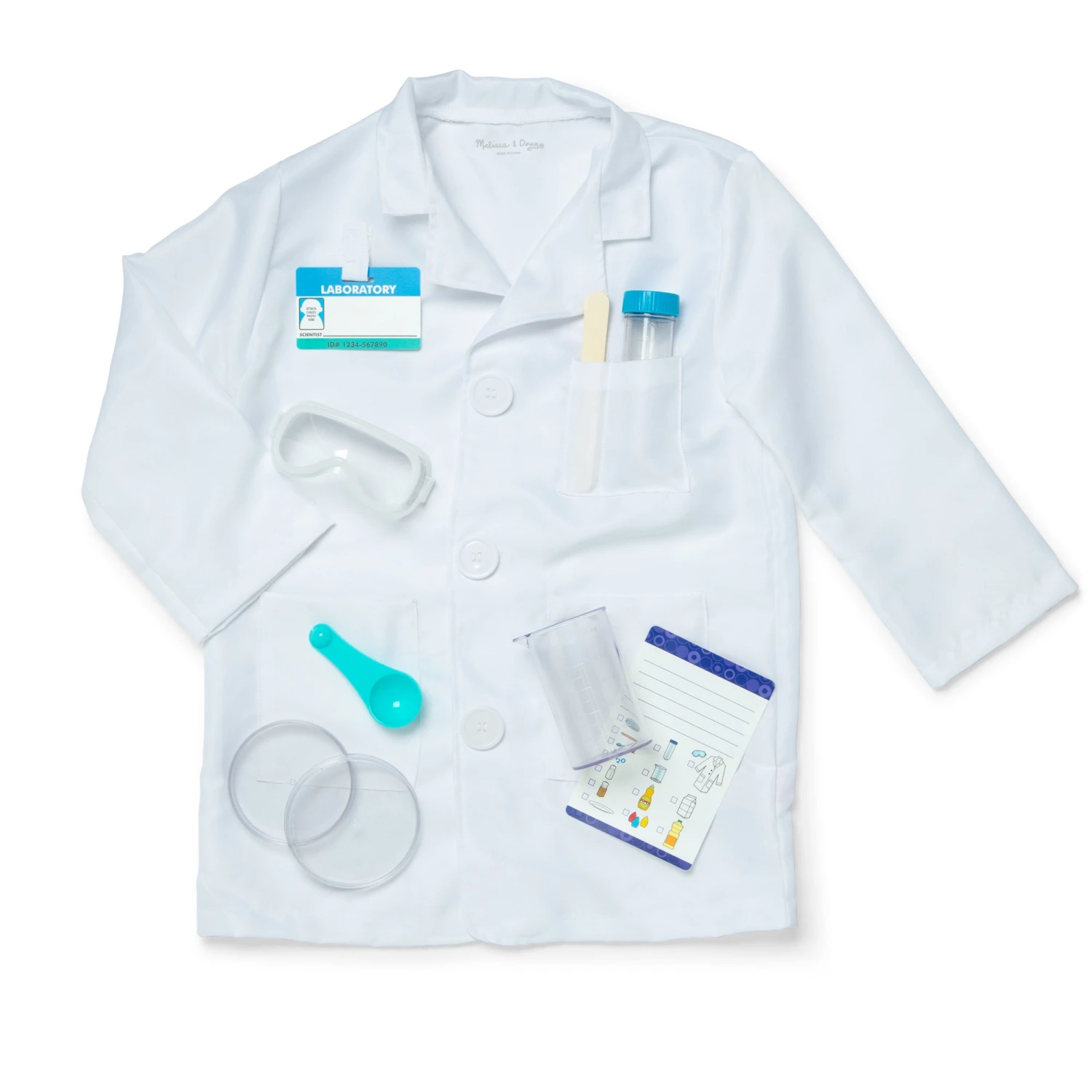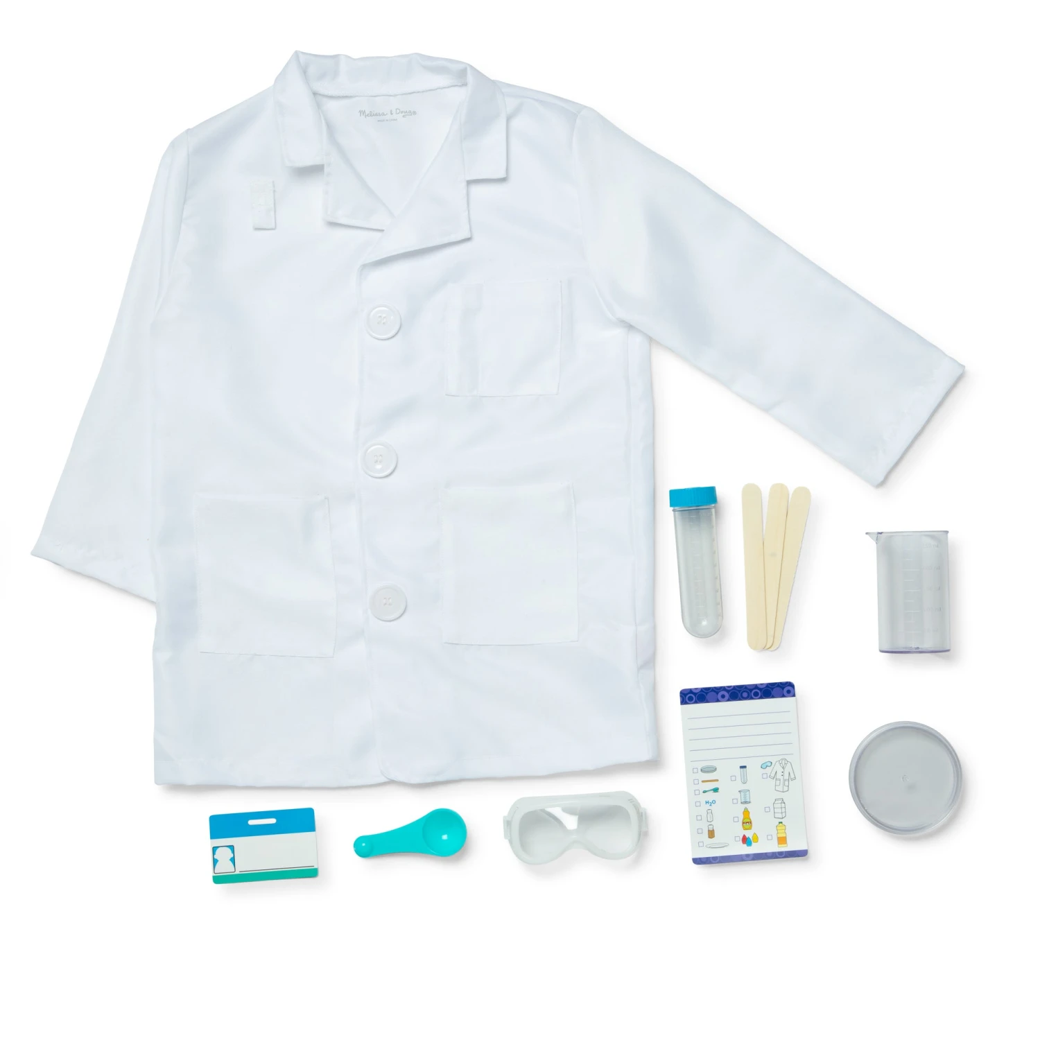 - Includes lab coat, goggles, name tag, beaker, test tube, petri dish, measuring spoons, 6 experiment cards, hypothesis card