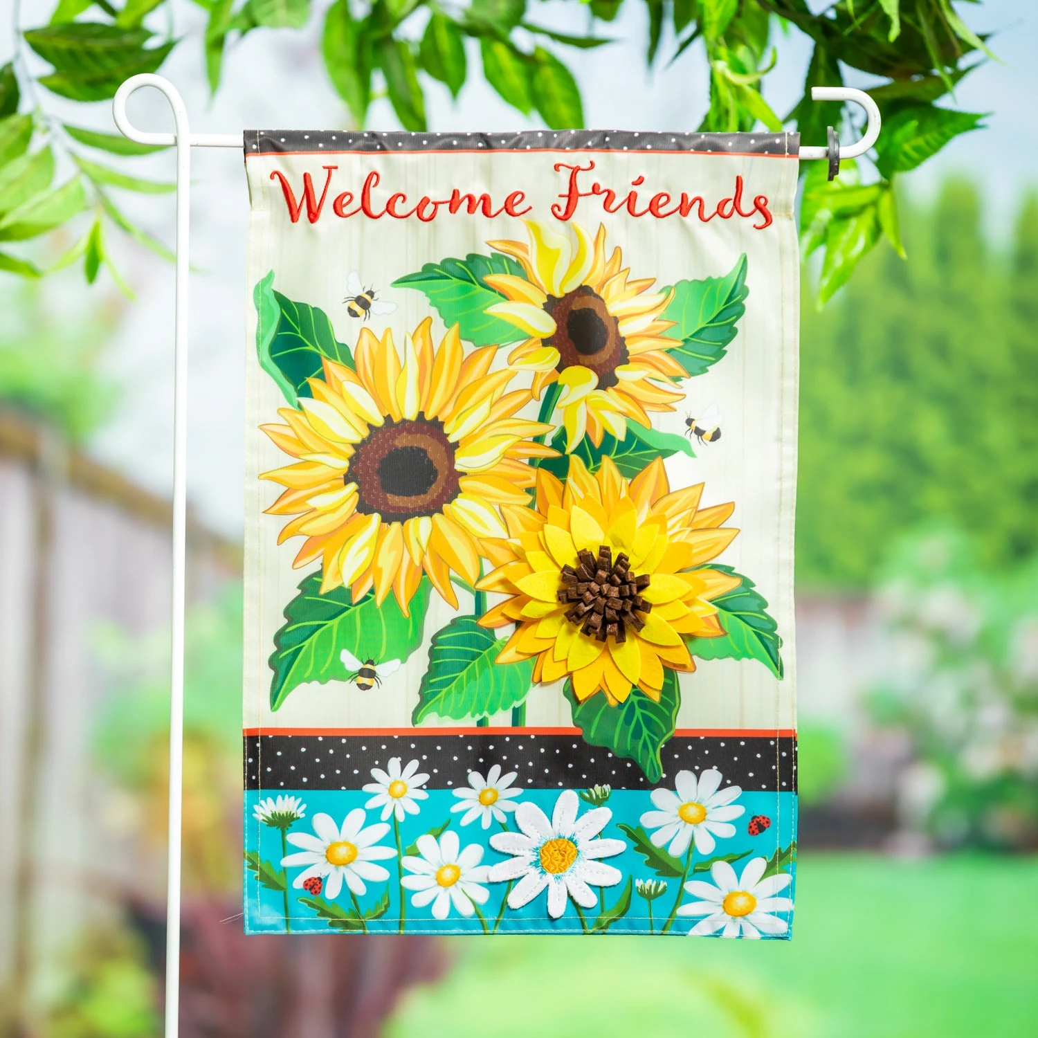 This Sunflowers and Daisies Applique Garden Flag adds an extra touch to any garden or outdoor space. Each Evergreen Flag Applique flag is carefully crafted from multiple layers of 310 denier nylon that can withstand a variety of weather conditions. We combine pieces of fade-resistant, strong fabric with tight, detailed stitching to create a dimensional mosaic effect. The soft yet heavyweight material illuminates beautifully in sunlight. Each flag features a sleeve that fits standard flagpoles or stands, sold separately.