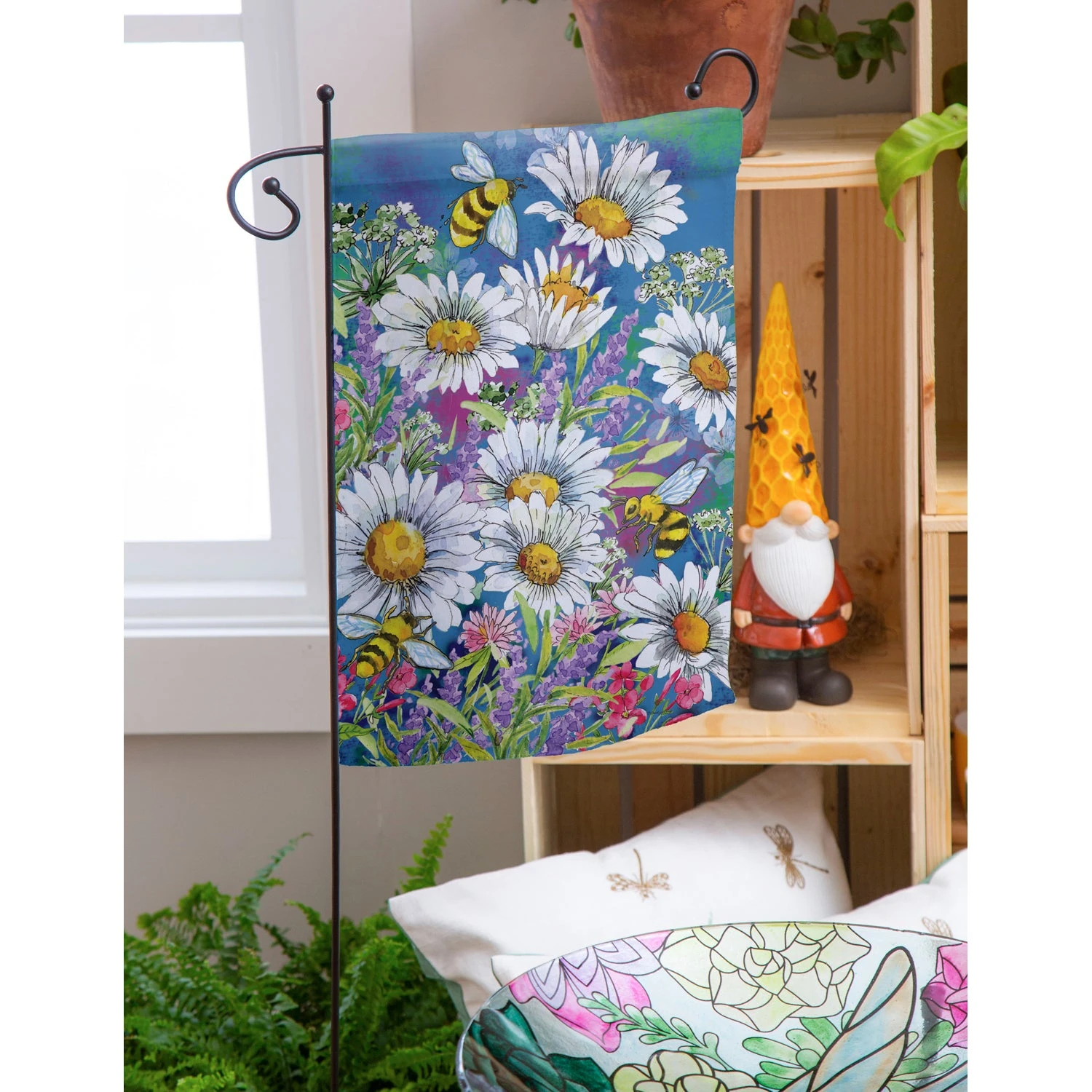 Daisies and buzzing bees sway in harmony on this charming garden suede flag. Perfect for spring and beyond, the watercolor effect on this design adds to its whimsical appeal. This Suede Reflections flag is made of medium-weight, polyester suede that provides a soft and durable texture. Artwork is heat transferred onto the sun-blocking material so that it is easily viewed from both sides. The weatherproof poly-suede will not fray or fade with continued outdoor use. This flag features a sleeve for use with any standard flagpole or stand, sold separately.