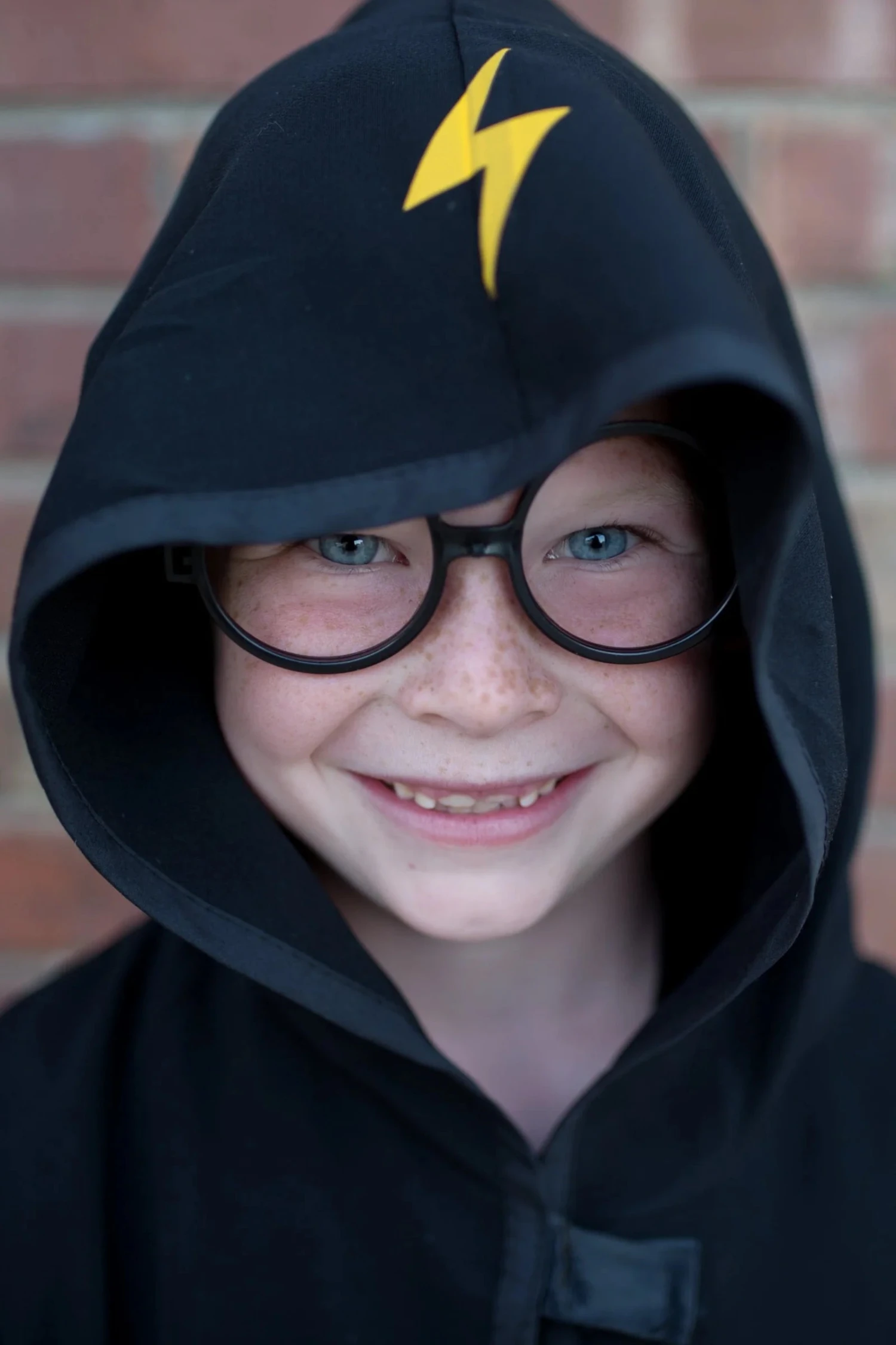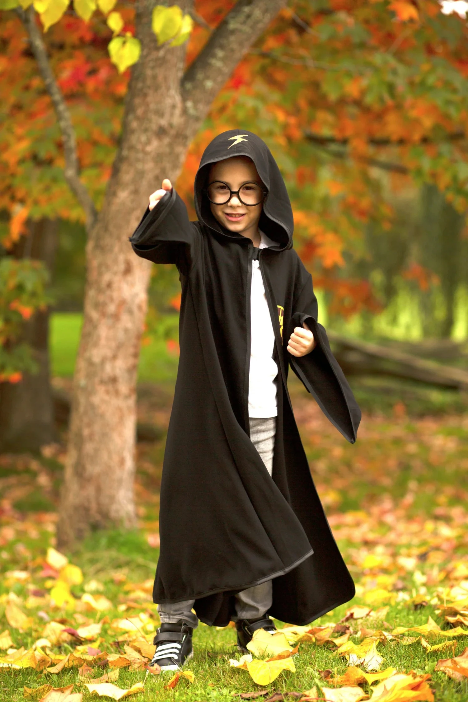 Congratulations! You’ve been accepted to wizardry school! Don’t forget to pack your Great Pretenders cloak. A high-quality design made with soft black fabric is draping comfortably on the body. This hooded black robe is adorned with a crest and a lightning bolt on the hood, and it comes with a set of faux glasses!