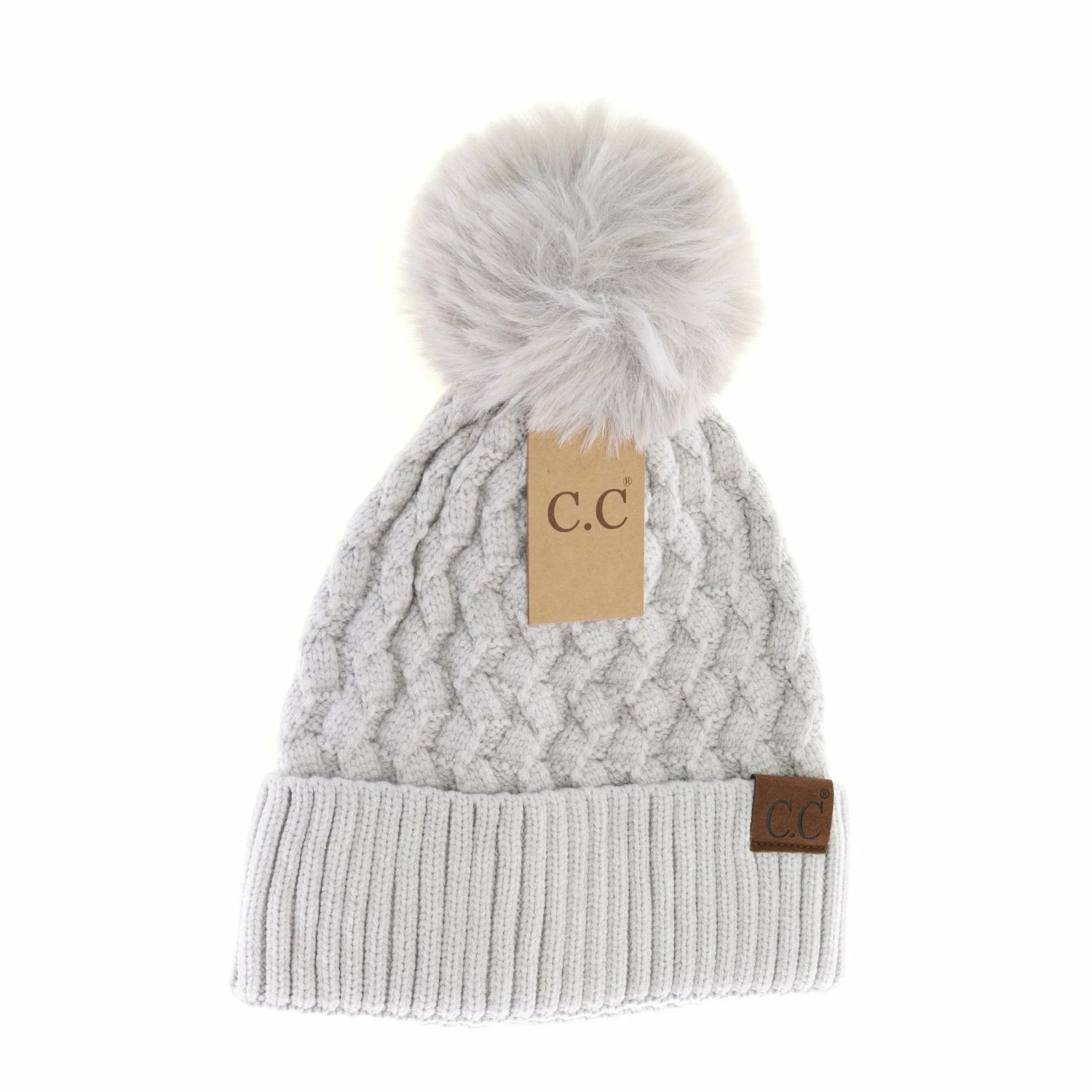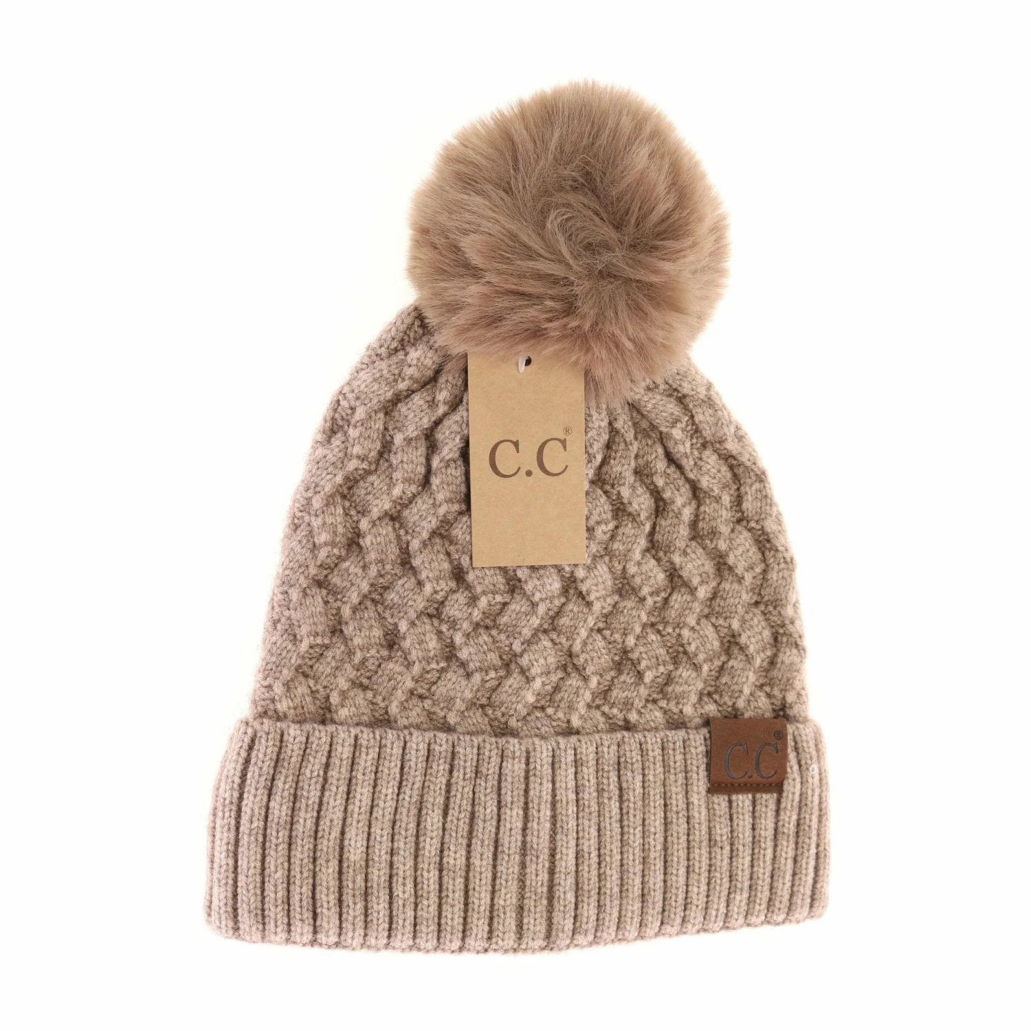 We love this timeless woven cable knit stitch. We added a super cute and soft matching faux fur pom to top of this cuffed beanie!